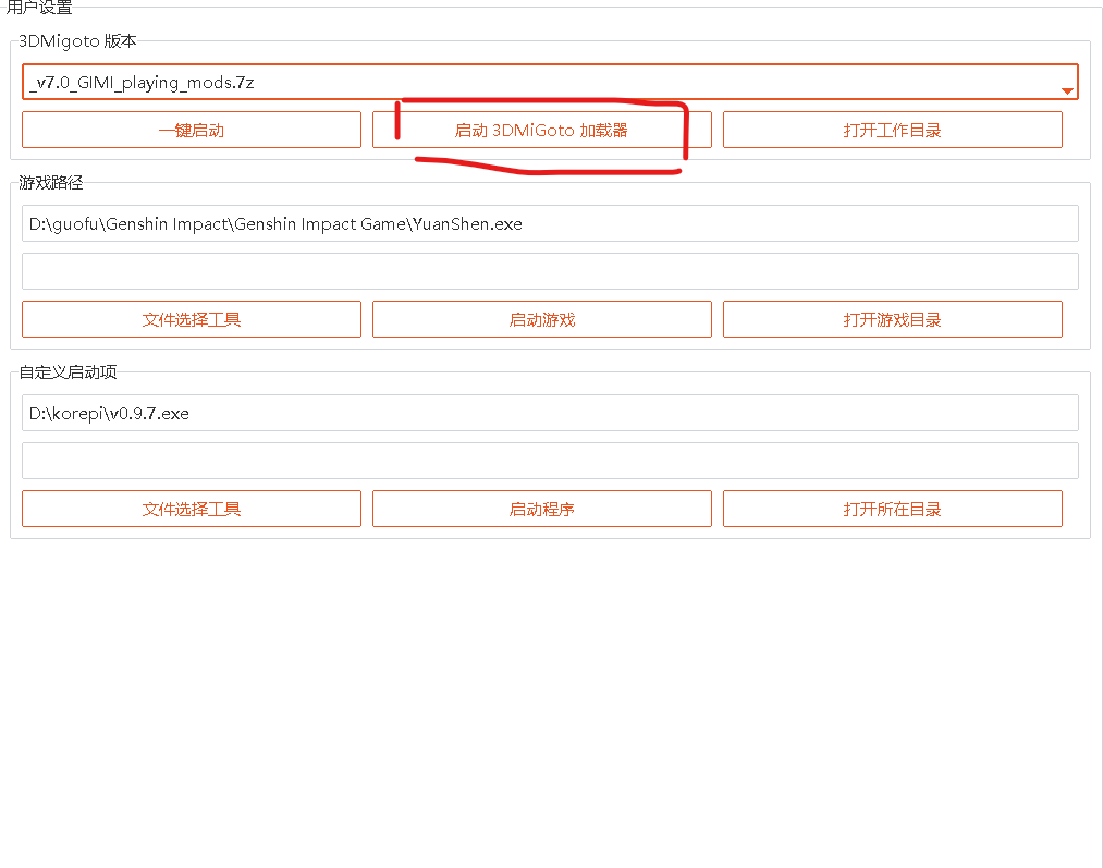 5.找到用户设置,先设置3dm版本,建议使用playing版本,然后设置游戏路径,点击文件选择工具选择自己的⚪神文件夹位置。最后在自定义选项中选择korepi的文件位置。