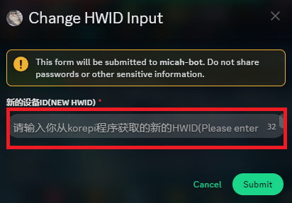 2. 在弹出的窗口输入框处填入您新的设备ID,并点击Submit
