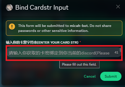 1. 点击〖1️⃣ 绑定卡密(Bind card str)〗。然后在弹出的窗口输入框处填入从经销商处购买得来的41位卡密,并点击Submit。