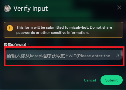 3. 点击〖2️⃣ 获取验证文件(Get verification file)〗,输入hwid码,然后点击submit。